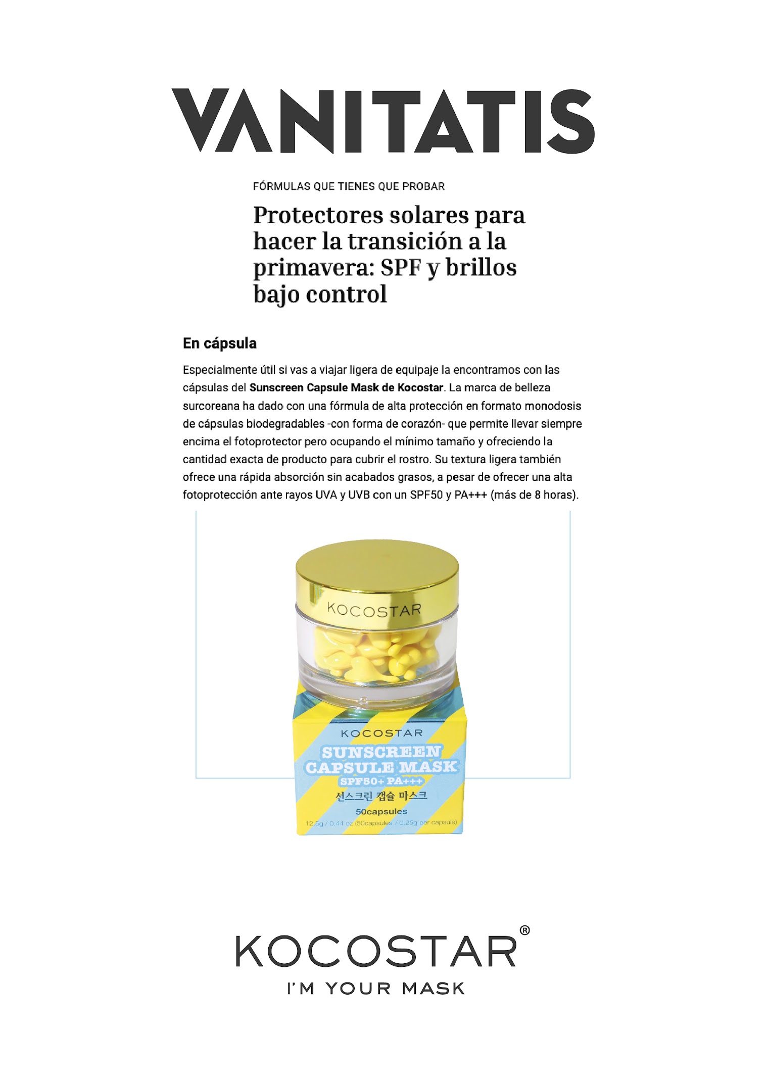 Protector solar de amplio espectro SPF 50+ PA+++ aplicable en monodosis. Protege frente a los rayos UVB y UVA. Con antioxidantes. Bloquea los rayos UVB (quemaduras solares) y UVA (fotoenvejecimiento) de manera eficaz. Con una textura suave, ligera y de rápida absorción; además, calman e hidratan la piel. Cada capsula contiene la cantidad ideal para aplicar sobre el rostro. Se pueden aplicar sobre el maquillaje (¡sí a la re-aplicación!). Son ideales para llevarlos contigo en cualquier momento. Con 50 monodosis (nada de solares oxidados o malgastar producto de forma innecesaria). Sus cápsulas son biodegradables, están hechas con almidón de maíz y carragenina. PROTECCIÓN DE ALTO ESPECTRO: Uno de los requisitos necesarios que exige el mercado coreano a un buen protector, es que ha de ofrecer protección de alto espectro: 1. Protección frente a los rayos UVA: los que penetran hasta la dermis, tienen efecto acumulativo y son responsables del fotoenvejecimiento, del cáncer cutáneo y de la aparición de manchas. 2. Protección frente a los rayos UVB: los que inciden sobre la epidermis, causando quemaduras solares. TEXTURA INCREÍBLE Y CON BENEFICIOS EXTRAS: Los protectores solares coreanos se caracterizan por tener unas texturas suaves, fluidas y ligeras (incluso con filtro físico), que te invitan a proteger tu piel de una manera muy cómoda, y además aportan hidratación, glow y jugosidad. Cuentan con activos también disponibles en sus sheet masks y serums preferidos, como activos hidratantes, humectantes y antioxidantes.